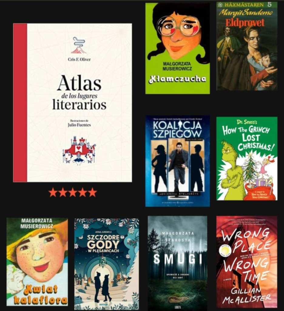 Najlepsze: Fantastyka – „Necrovet. Usługi weterynaryjno-nekromantyczne” Joanna W. Gajzler Obyczajowa – „Daisy Jones & The Six” Taylor Jenkins Reid Świąteczna – „Szczodre Gody w Plęsawicach” Anna Jurewicz Dziecięco-młodzieżowe – cykl „Jeżycjada” Małgorzata Musierowicz (w tym roku przeczytane 5 pierwszych, ze szczególnym wyróżnieniem dla „Opium w rosole”); „Antosia w Bezkresie” Marcin Szczygielski; „Atlas miejsc literackich” Cris F. Oliver Kryminał – „Smugi” Małgorzata Starosta; „Nie to miejsce, nie ten czas” Gillian McAllister Powieść graficzna – „Mapa i terytorium” Michel Houllebecq Literatura piękna – „Nikt nie odpisuje” Jang Eun-jin; „Księżyc nad Bretanią” Nina George Historyczna – „Północ i Południe” John Jakes